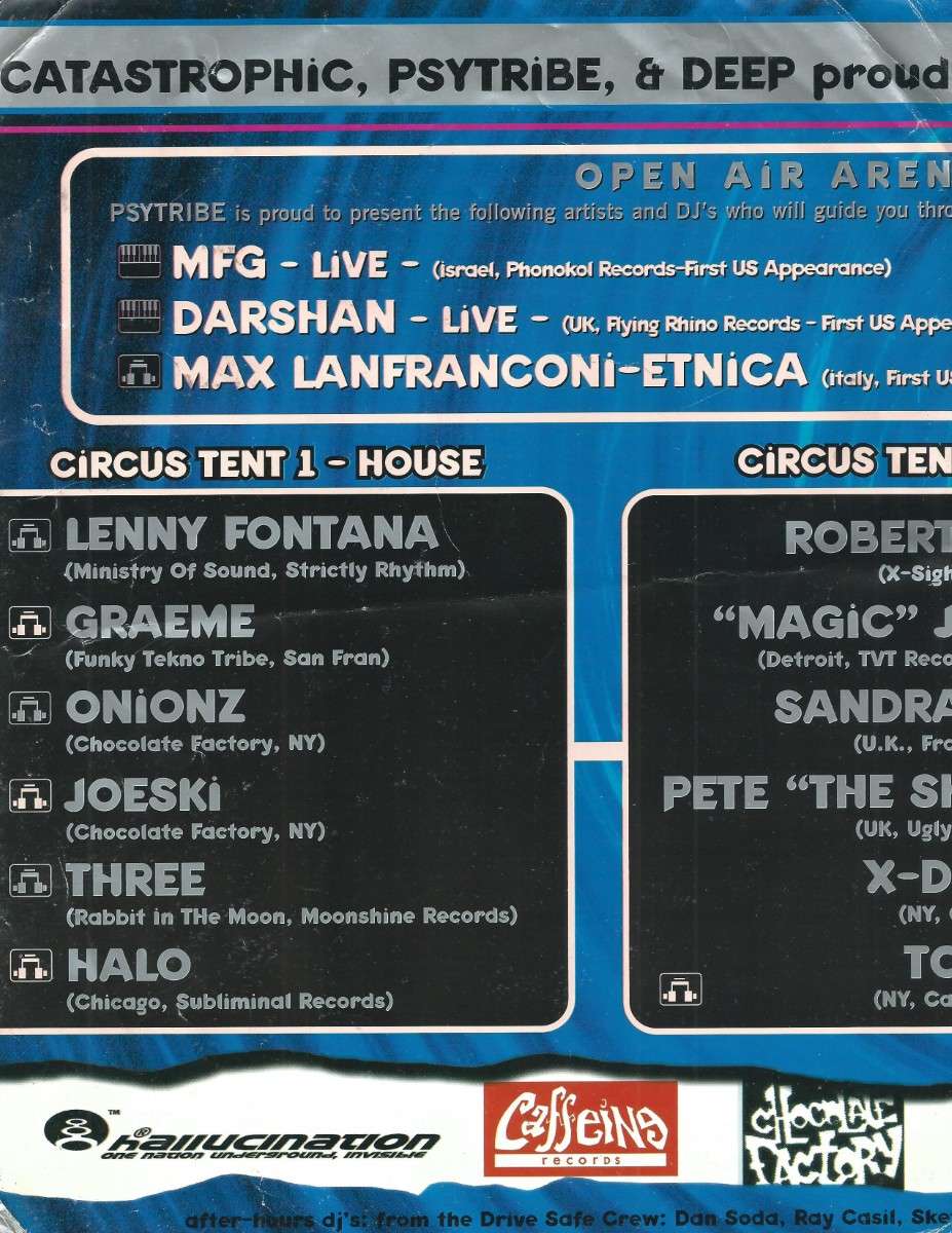 X-Dream (Blue Room, Germany) DJ Lucas (Blue Room/Metalspark, Amsterdam) Matthew Magic (Project Beyond) Guy Frenkel (Family, NYC) DJ Ariel (Israel) Backdrops and Decor – Blue Room America, Severin, Psychedelic Pleasures (NY) Jamin (NY) Moon Walker (Bali) Vinyl