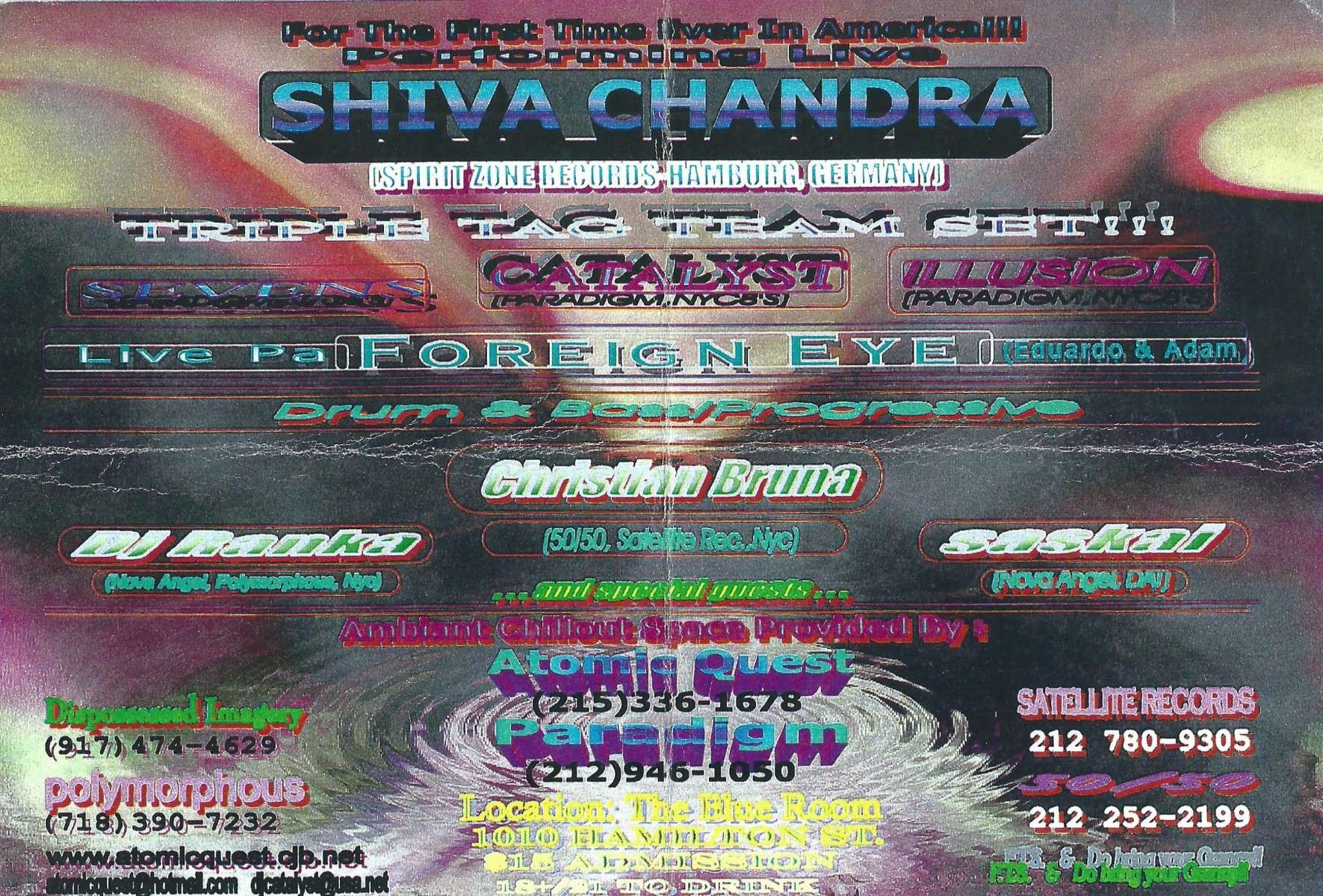 Now for the NewYears update – (this is the shit. if you don’t have $105 for Tsunami GO HERE. Tsunami won’t open until 1AM (you heard it here first – the owners of Vinyl want it for a private party until 1am) so if you want to be with the Trance Folk for the countdown this is a must. Me, I’ll be here until 4am then off to Tsunami until 10PM next day- if $ is no object (perfect wyrld) then by all means go to BOTH party people!!) also, keep in mind there is NO COAT CHECK so you’ll have to manage – maybe bring a pack combination lock with a metal cord, $10 at EMS camping stores – or if yer nice you can pile it in with my brainmachines shit) MILLENIUM VISION time travel with psychedelic trance A SubtleChaos Science Production, one time only for Millenium celebration in New York! Location: 40th Street between 9 & 8 ave. Walk east 20 meters towards 8th on 40th Street, look for a door on the right with a “nuclear shelter” sign and flyers on the door. (this is the same location as AlphaTrance events) Party starts at 2am 01.01.2000. Before 2am, the music will be playing but the crowd might be quite random as flyers will be given out on the street… (sorry, the club wants to make some money they pay $75). After 2am though the place is ours until we are finished, my guess is that most of the non-trance crowd will quickly want to leave, we are determined to make this is a real trance event for the rest of the time. We have no time limits, we might end up quite late if you want us to. The special price for friends, listies, all new york party people is $30, please email me with your names, you will receive this price only if we have your name before Dec. 31St. Otherwise, the club might charge full price. Please bring the flyer with you as well. Flyers will given out by us, AlphaTrance and friends, no flyers in stores. A URL for the flyer will be posted shortly. This is full-on psychedelic night, long DJ set by us, and some surprise guests from Israel (some really old friends just arrived to spend holidays in New York, so some foreign talents will be heard). Drinks, visuals, chai, we’re working on it… Ohh yes, we are aware of the toilet problems !:-) no worries, this time the club will have their employees working during the party, constantly helping to keep it clean. We are creating this event as an alternative to Vinyl, we know that not all can get in that club and not all are so interested in the line-up, we will try to have a small party for friends, that we can afford & enjoy to the end. Vadim SubtleChaos