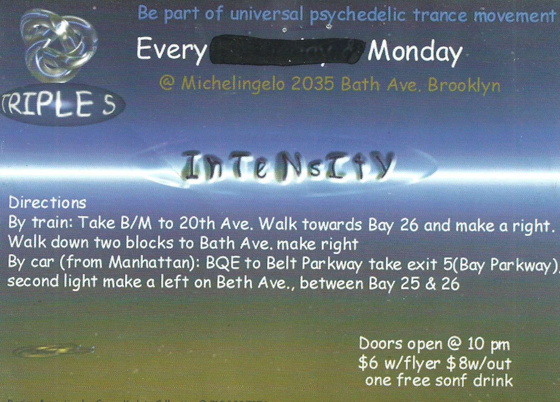 RE: the New Years Party t 40th & 9th. It’s looking better and better, as it looks like someone won’t have to put on the alien mask rollerblading with bullhorn and Freddy Krueger claws to scare out the general public fux so we can get some rheum to dance. If you want to be somewhere before the ball drops this is the only trance party, as Vinyl is going to take some time to get kickin’ before the private party for the club owners is over at 1 or so when the $105 Tsunami begins. Make no mistake, I’ll be there too, it’ll just take me a long while. Hello travelers, We have convinced the club manager to do this party in a proper way, it will be strictly trance crowd party as usual. A small amount of flyers will be dropped at some clothing & music stores, but the most will probably be you people. This also means that you can come early around 10pm, we will have midnight champaign, live video from the streets, later chai etc. Price is still same those who are on the list or have a flyer, can pay $30 at the door or $50 if you are not on the list. Vadim SubtleChaos