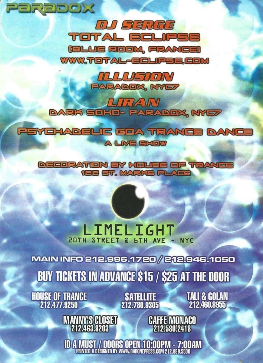 This will be a weird mix. Part of it will be free Israeli desert trancers and part of it will be random NYC tourists. Expect a vibe conflict of alcohol drinkers from say, Dublin, and an assortment of hallucinating global trance people from Israel, Russia, and Sweden. And about 20% American (Limelight will up that to about 45%, hence the potential vibe deflation) There will also be some esoteric French trance people. As it is in a deconsecrated Episcopalian church, there will be plenty of mixed metaphors, alchemically trancemitting the message from the Holy Land. Christians beware. But I think it is good to mix it up, that’s what the city-state of New York is all about. The NY Times is doing a story on the “scene,” BTW. Let’s help spread the word about this positive, life-affirming movement. Sure, some people are smoking marijuana etc, but the net NET is a gentler kind of scene where people are eager to meet other intelligent people. I’ll take that over a mob of desperate drinkers any day.