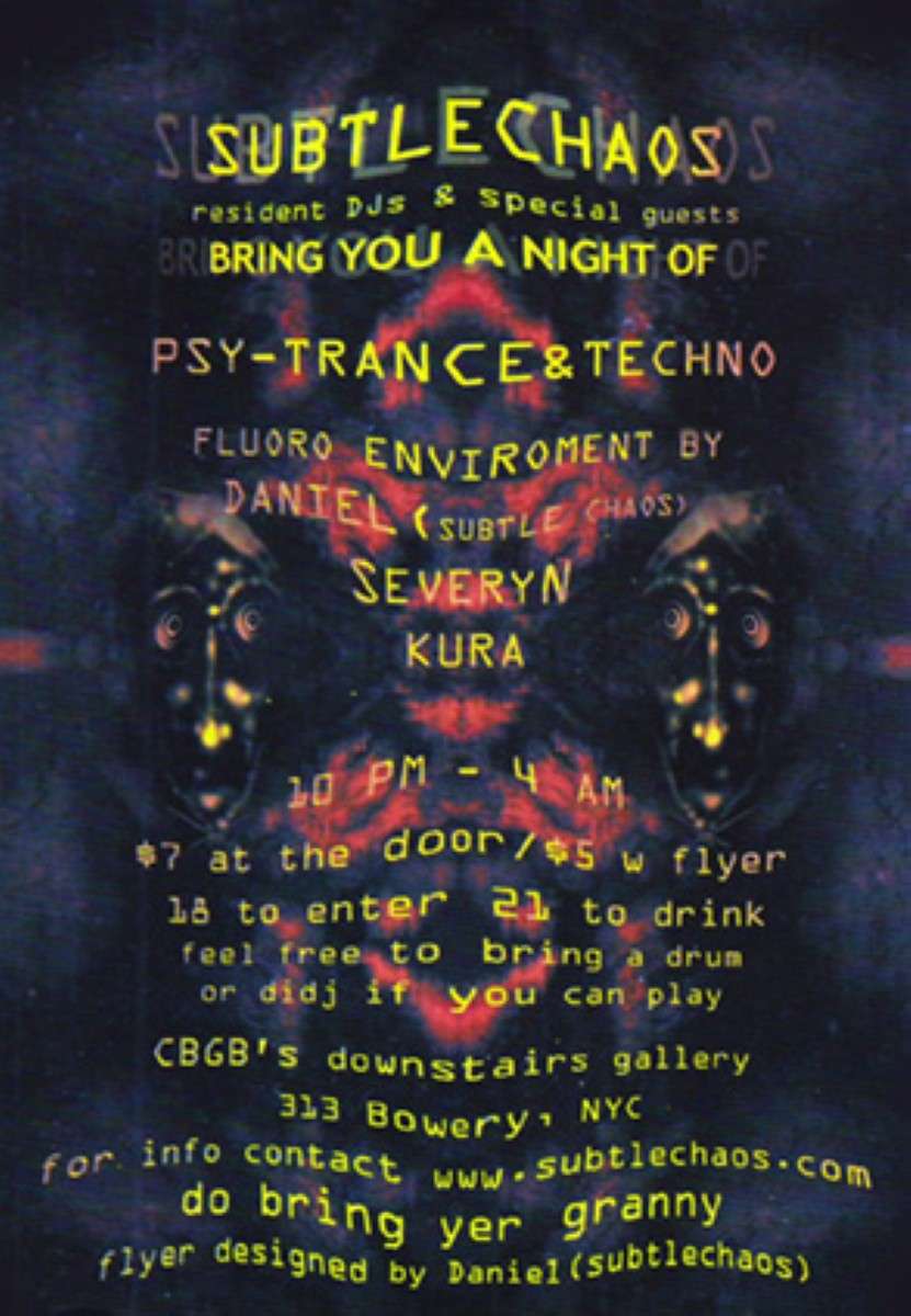 SubtleChaos at 212.216.0661 THE MILLENNIUM PARTY!!!! Totally disinfected, no muchsrooms, no projections, no anthems, no end-of-war victory songs, same place Hell’s Kitchen at 40&9th will be filled with chaos the millennium night, more details will follow. One thing for sure it won’t cost you your week’s wages and we’ll try our best to blast off into next 1000 years with a super party. Hello all, Thanks for your kind support throughout this year, we promise that SubtleChaos will keep you dancing full-on and taking your mind far away places where only the strong survive… We continue to research new music you can hear new styles and new sounds in our sets coming from all over the galaxy, we do think, however, that new is good, but only as long as the old is remembered. Experiment with us. Our SubtleChaos studio is working, as much as we can, we try to put our fingers on the knobs every moment we have free, so new millennium will bring us “live”. Until then please be patient, it’s not so easy and don’t try it at home. Prolonged trance-recording sessions do cause psychotic disorders… whom should we thank… All artists that make their music make us wish we were there… Aleks, Jeff, Kristina, Mike, Max, DJ MoonWalker, DJ IndiaDrop, Rijaya & friends, Mathew Magic, Mark, Gosha, friends at Phantasm, Yon-E, Gabi, Lior, Severin, Ceasar, Alex, Daniel (hope to see you back soon!), Peter, Simon, Sam, Daniel V., Twinsun, Thrash, Bjorn, Chaos Unlimited, all old friends in Israel, Germany, Sweden, UK, Spain, Moscow… all New York party people for your nuclear vibe and smiles. Happy Holidays! Many thanks to all promoters and organizers that helped us find a place to play.