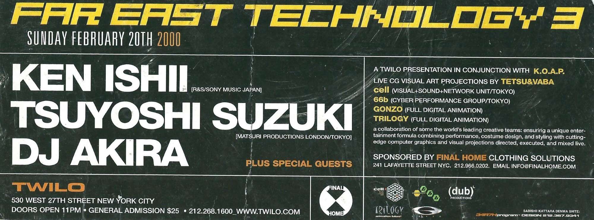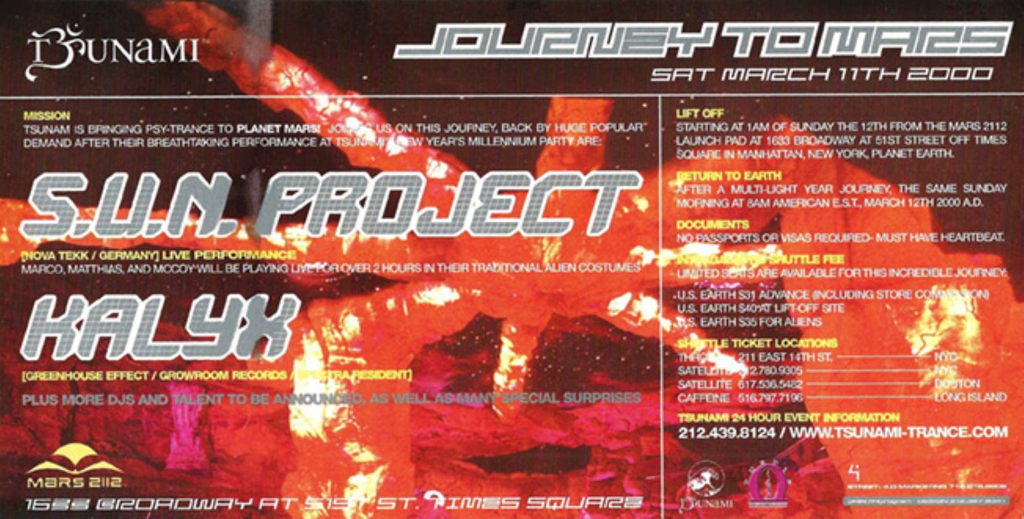 Infected Mushroom Live -(BNE, Israel) introducing their newest “Synphonatic” to feature on Tsunami’s compilation to be released in Sept. 2000 For the first time in America HuxFlux Live (Spiral Trax, Sweden) Dennis and Jonas perform their cool nordic sound from one of the world’s most cutting edge label Decor and Visuals by Organix (Tokyo) DJ sets from Erez and Duvdev of IM, and also from Moander and Alan Sachs. $25 in advance, $30 at the door. Separate chill-out room and lounges with separate meditative trance-ambient music. This will be an incredible event and Tsunami will get the entire place to themselves. I encourage everyone to come. Tunnel 12th Avenue & 27th Street