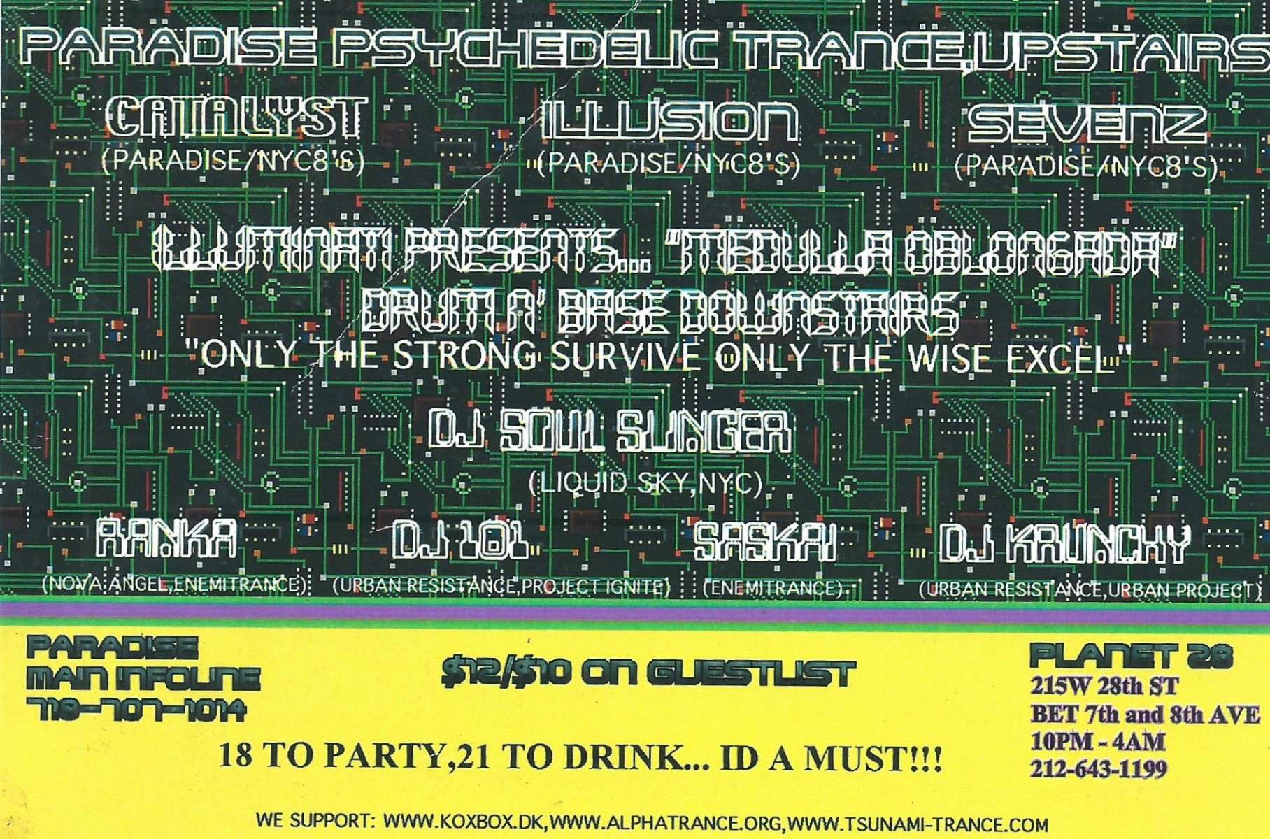 Dear list members, This is what I’ve been waiting for… Friday the 11th is the night. I Robot, AKA finally have my own space to do some insane things with. This is the first party I have thrown since Neurotrancemitter, Serotonin Selector, and Dopamine Detergent last year. My first installment is called KABBALA. The general theme is the way-out mindbending astrophysics in the Hebrew Kabbala. Trance will be the audio force driving your consciousness through the path to enlightenment, mixed with some Hubris ‘cuz we ain’t supposed to be getting into the Kabbala until we’re at least in our forties. The labyrinthine space includes a bar, two dance rooms, (One trance, one progressive house) One room will be chillout with a KABBALA reading room/brainmachine/cranial electrical stimulation installation, plus COATCHECK. Trance DJs will include the debut of Machinelf, and possibly F/X Mike and/or Subtle Chaos. Progressive House DJ’s are… who cares? Open Bra, I mean, Bar, all night. Giveaways throughout the night. Free Million Dollar Bills. Location: COUNTDOWN STUDIOS 122 W 26th St, Level 2, Buzzer 25 10p til’ until at least 5am. Cover is $20, $15 if you are on the BRAINMACHINES list and give your email address at the door there will also be a weird theme of free fluoro face painting, in recognition of the vestigial visage of your traveling spirit, under heavy black lights. Also, there is a trance party tonight at Cream in the Upper West Side… check yer email from a week ago silly.