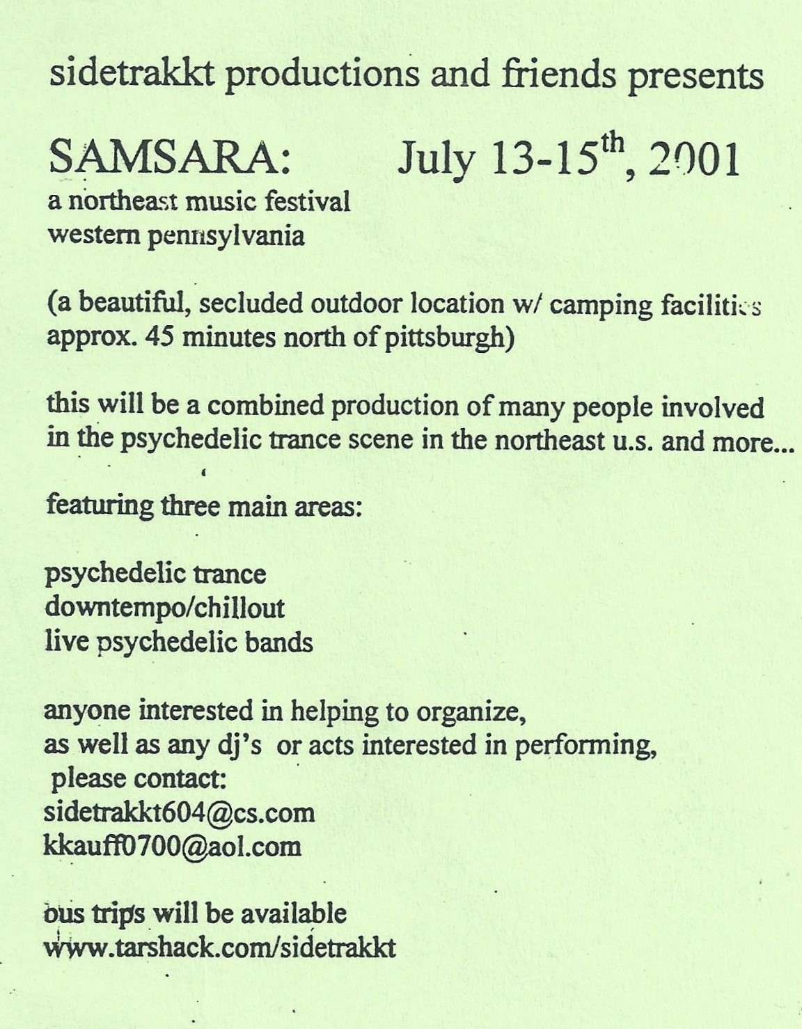 a psychedelic musical journey guided by: SYN HRO (T.I.P. Records/ Liquid Audio Soundz/futuretechartists – Netherlan ds) Jeroen van Garling, aka Synchro, is one of the world’s leading psytrance producers, and his diverse style can be described as breakbeat-influence DMT psychedelic trance, with a touch of techno and funk. His third album, Ele ktrik, continues to penetrate the borders of the psytrance sound, and has helped to make him one of the world’s most sought-after acts. Based in Amsterdam, he will be making a rare U.S. appearance, and his first-ever Pittsburgh appearance. web DJsynchro Ex Nihilo (Psychedelic Trance Liberation Front – Detroit, MI) From his early roots of producing ambient music with Clark Warner (of Minus Records), Travis’ style has evolved into full-on psychedelic trance, which he has been producing for four years, as well as DJing and throwing underground psytrance parties in Detroit. His full-on set, which will feature original material, will devastate minds and dancefloors alike. Count Zer0 (sidetrakkt/ elite – Pittsburgh) Prepare to be entranced by intense tribal rhythms. The Prophets of Nya (sidetrakkt – Pittsburgh ) Electric Mayhem and Snakecharmur will hypnotize you with a special sunrise set of psychedelic morning trance. This will be the final Mandala. (but not our final event!) This event is FREE! (but donations greatly appreciated) Outdoor location to be announced the day of event. Happy birthday El ectric Mayhem. for info and directions: web sidetrakkt 412-553-7614 web sidetrakkt/july27.asp