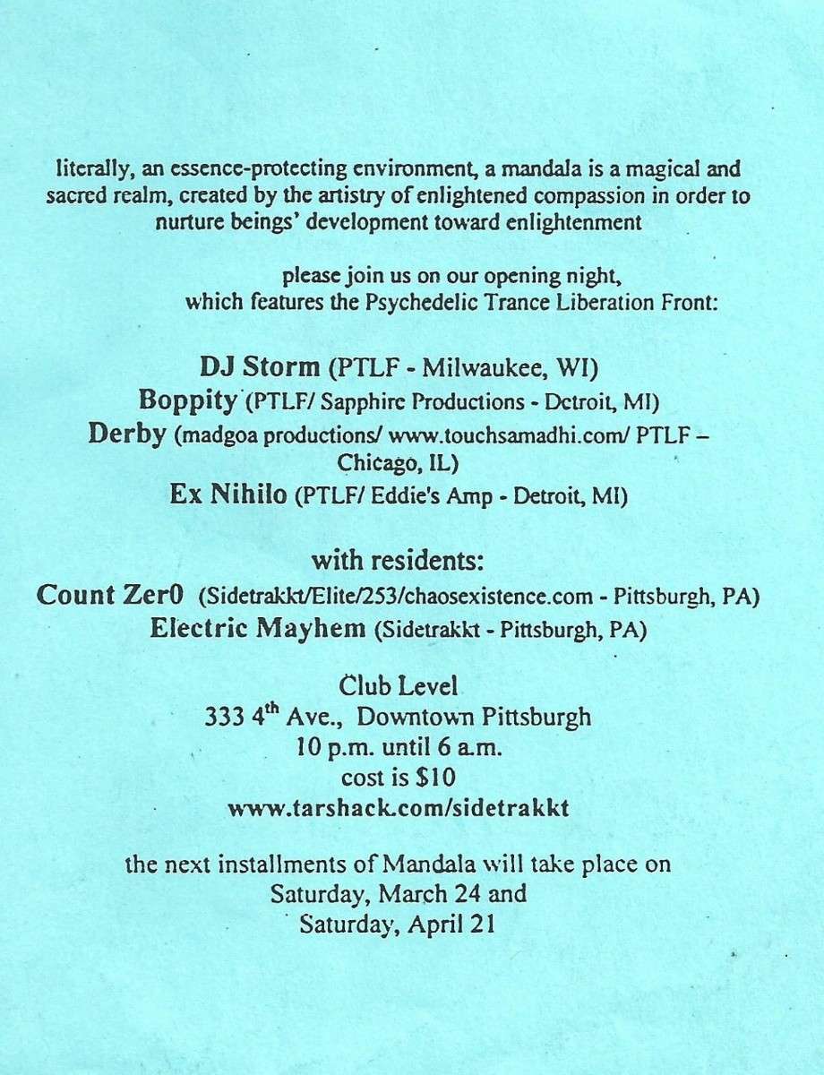 JUNO REACTOR (UK) (live) and MEDICINE DRUM (uk) (live) July 27: SYNCHRO (Netherlands) and ex nihilo (Detroit, mi) with residents: count zer0 and electric mayhem (sidetrakkt – pittsburgh) mandala takes place the last Friday of every month at level – 333 fourth ave., downtown pittsburgh more info to be announced… web sidetrakkt july 3rd, boston TSUYOSHI SUZUKI joujouka tokio drome matsuri records Tokyo/London/NYC DUTCH thump-radio inner-eye area 51 san fran – medicine drum has been added to the juno reactor tour! this will be a live performance featuring all three (and possibly a new fourth) members. “sadly, the venue we were using for mandala has been sold, and we are no longer able to use it… the juno reactor/ medicine drum show has been moved to the irish centre of Pittsburgh (6886 forward ave.) this is probably my favorite venue in Pittsburgh, and is where my first event, gyrophare, was held. Unfortunately we have to have people out by three a.m., so we are relocating at that point to a smaller venue for the second phase of the event. so basically, the first part will consist of live acts: twine, erth, medicine drum, and juno reactor. the second part will be a full-on psytrance party beginning at 3 with DJ’s count zer0 and electric mayhem, with an ambient/ chillout room featuring live acts twine and sund. the second part will be free, however you must attend the first part where you will get your free pass. with the loss of level, finding an adequate and affordable venue in Pittsburgh has become a difficult task… it’s been a very crazy couple of weeks, but I actually think this will work very well. we are looking into the best way to deal with travel between the venues. most likely we will have some sort of shuttle that will run. but my suggestion is to hold out until 3; everyone can all drive sober and then have a collective experience at the second venue…” upcoming other lineups include: may 25: DJ Witchman (morgantown, wv) and boppity (detroit, mi)