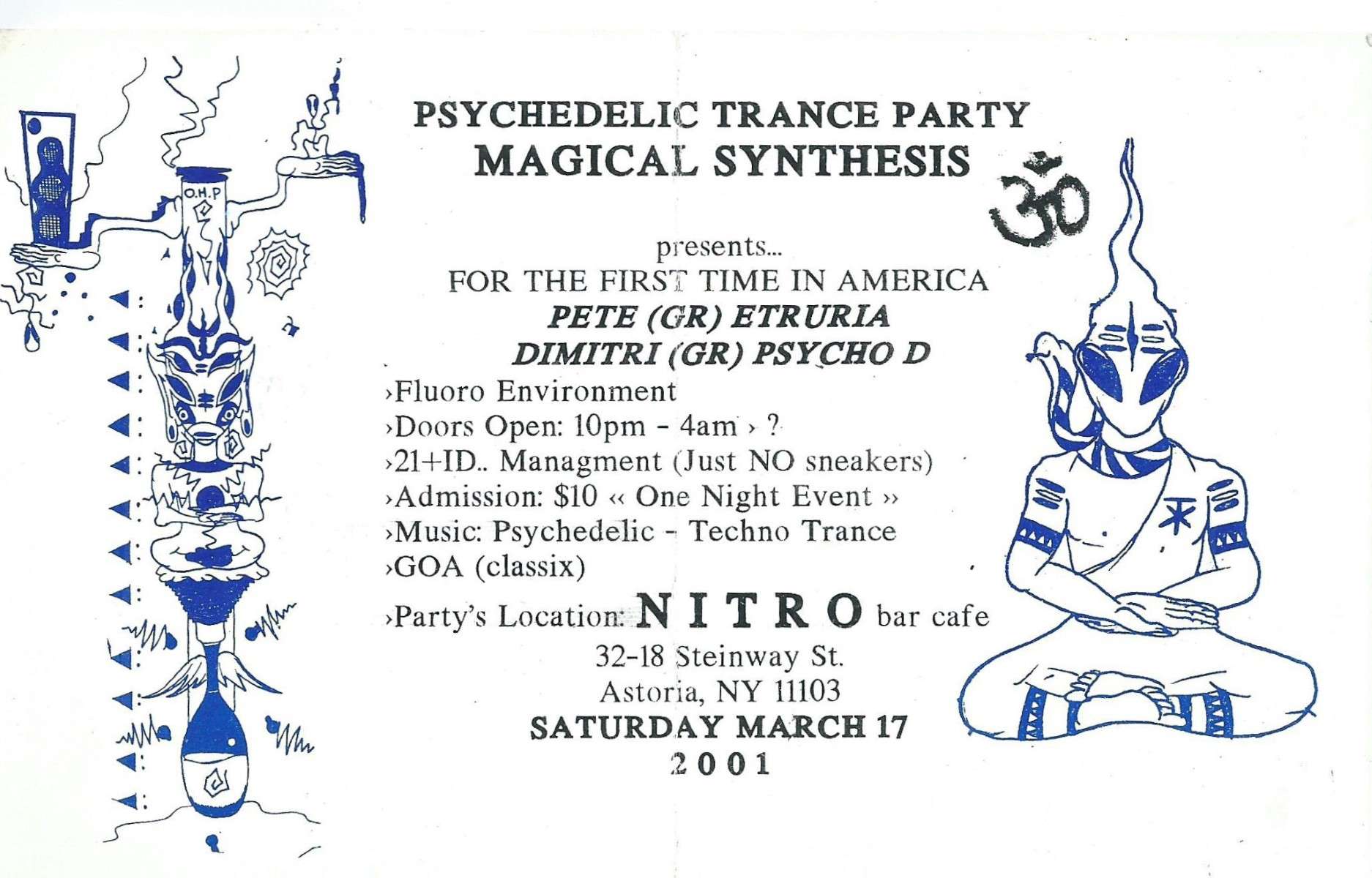 the DMT Feel free to forward to your favorite psy-trance people… The Full Moon is out this weekend. The weather forecast is partly cloudy, low 55 to 60 and high in the upper 70s. I you happen to be up this fine Saturday morning (June 9) come join a fine group of folks at a psychedelic potluck family get-together in a spacious Tribeca loft. Back again, vastly improved space and sound system… and this time no 18 hour bridge event to compete with. Not a full-on dance after party (that’s at Twilo 🙁 but a friendly chillout. Many new surprises. 146 Duane Street (call from the entree from the street) 8:30am-4pm HOW MUCH Lucky $7. Everyone will be asked to donate to the Cause. If you bring extra water, refreshments, OJ, chai, paper towels, whatever, your cover will be reduced. $5 reduced admission for DMT members. All proceeds will go towards food for the needy (that’s me right now I’m down to 150 lbs 🙁 WHERE Tribeca. 146 Duane Street between Church and West Broadway. Once there call for entree from the street. Directions are the end of this email. SOUND DMT Sound system, CDJs. 7am-2pm and possibly beyond. We can go through the night if we behave ourselves. If you were there for the afterparty for the Marij. march you know the deal. The sound will be chill at 7am and build and build and crescendo to full capacity around 11am and then chill on the volume a TINY bit around noon and then… onward and upward. Please respect the neighbors that are in the building, don’t hang out in the hallways etc. SPACE 2000′ loft, 20′ ceilings, Grecian pillars, huge windows, brainmachines, oxygen, costumes, incense, internet access, video projections, video games, T-shirts, CDs, UV lights, fluoro tapestries by House of Trance, some fog, crazy lighting, vornado fan, working toilets, yoga on the roof. MUSIC DJs- Skilled and inspired DJs from the DMT will be representing. Aspiring DJs are welcome to contact me regarding playing. The best DJ present will get a free ticket and a spot to play on the DMT Summer Boat Cruise on June 22. Requests off Napster at a $5 donation per pop (196 kps). PEOPLE A mishmash of friends, fiends, trance people. REFRESHMENTS Bring your own bottled water, virgin’s blood, juice and food. There is a fountain of youth with running water to refill your water bottles. There is a nice Punjabi place with excellent samosas one block east. BRING if you get a chance, artwork and painting supplies would be enlightening, and a blanket if you be shillin be chillin be children. THE SOURCE All proceeds go towards doing more of this dodgey business, i.e. my summer move into this space. Special thanks to Parasense for keeping it unreal.