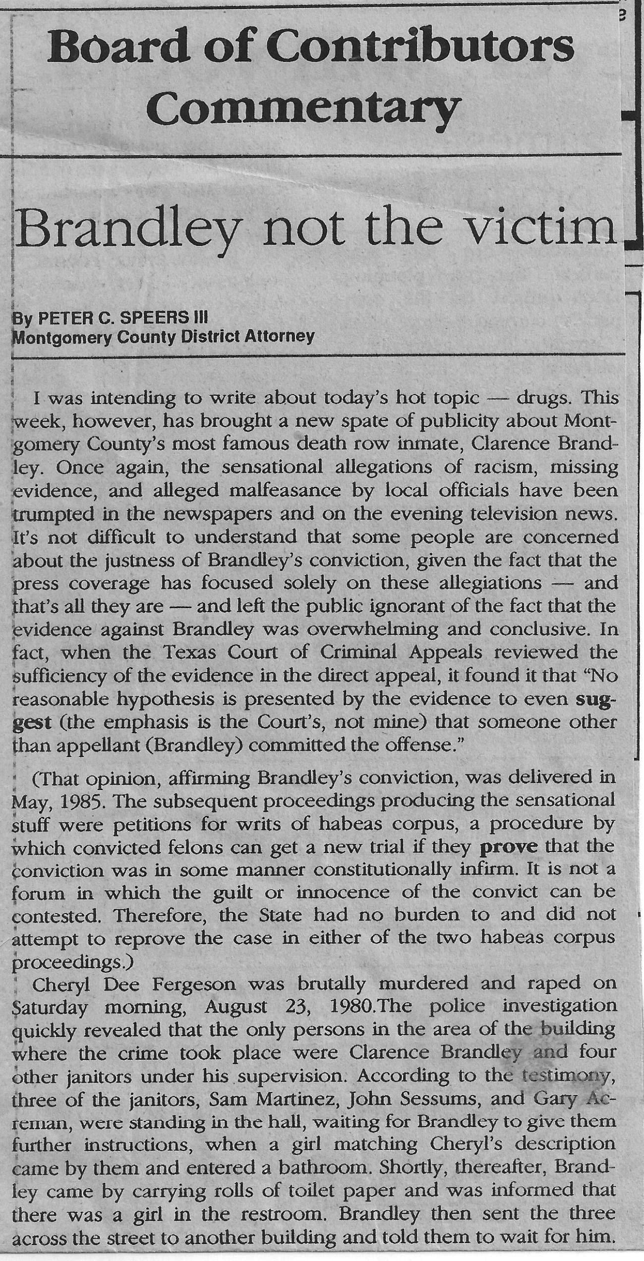 Here is the opposing viewpoint. Kind of difficult to square this editorial with a DNA test that proved Brandley’s innocence: